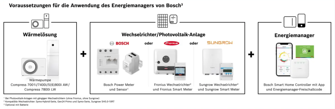Voraussetzung für den Energiemanager im Bosch Smart Home ist eine Wärmepumpe und eine Photovoltaik Anlage mit einem Fronius Symo Wechselrichter oder einem Sungrow Wechselrichter oder einem Bosch Power Meter, die beide mit dem Internet-Router verbunden sind.