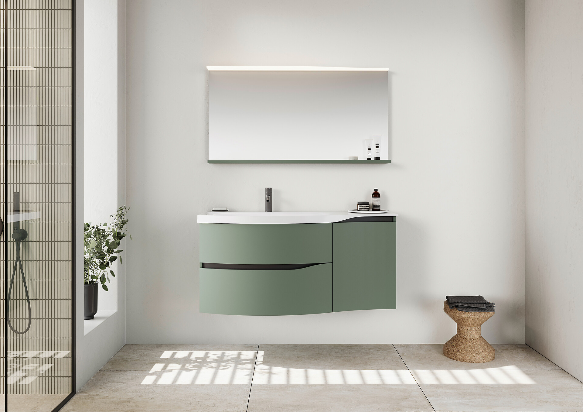 Inspiriert von weitläufigen Landschaften mit sanften, sich hintereinander schmiegender Hügelkuppen zieht sich das dreidimensionale Wechselspiel von konkaven und konvexen Formen und horizontalen Linien über das gesamte Programm von Sinea 3.0: Mal wölben sich Möbelfront und Waschtischkante vor, mal weichen sie sich verjüngend zurück und bieten so ein Optimum an randnah realisiertem Beckenvolumen und seitlicher Ablagefläche. Auch Ablage und Lichtsegel von Wandspiegel und Spiegelschrank folgen diesem rhythmischen Richtungswechsel: Während die über der Armatur tiefenreduzierte Spiegelablage Bewegungsfreiraum schafft, wölbt sich das darüber schwebende Lichtsegel wieder vor, um das Gesicht von oben optimal auszuleuchten. Die Schränke nehmen das horizontale Wellenlinien-Design durch den Dekorverlauf und die markanten Griffmulden auf.